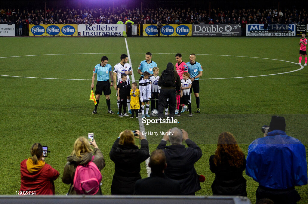 23 September 2019; Supporters take pictures of the coin toss during the SSE Airtricity League Premier Division match between Dundalk and Shamrock Rovers at Oriel Park in Dundalk, Co Louth. Photo by Harry Murphy/Sportsfile