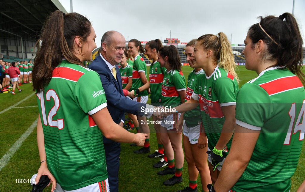 6 July 2019; Liam McDonagh, President of the Connacht Council, LGFA, meets Sarah Rowe of Mayo prior to the 2019 TG4 Connacht Ladies Senior Football Final replay between Galway and Mayo at the LIT Gaelic Grounds in Limerick. Photo by Brendan Moran/Sportsfile