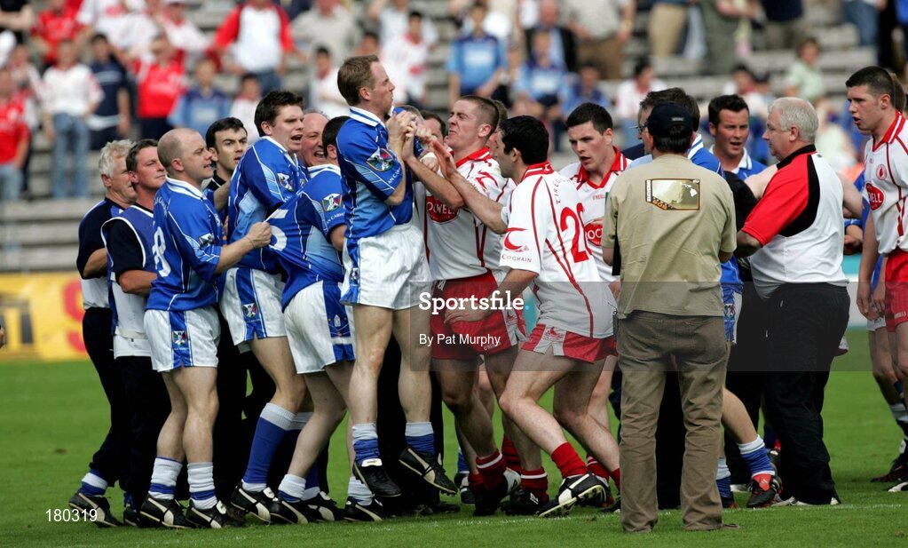 19 June 2005; Cavan and Tyrone players tussle after the game. Bank of Ireland Ulster Senior Football Championship Semi-Final, Tyrone v Cavan, St. Tighernach's Park, Clones, Co. Monaghan. Picture credit; Oliver McVeigh / SPORTSFILE