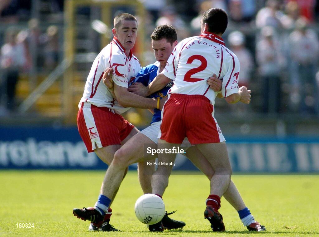 19 June 2005; Finbar O'Reilly of Cavan in action against Philip Jordan, left, and Ryan McMenamin of Tyrone during the Ulster GAA Football Senior Championship Semi-Final match between Tyrone and Cavan at at St Tiernach's Park in Monaghan. Photo by Pat Murphy/Sportsfile