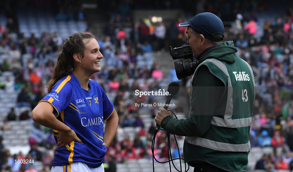 15 September 2019; Caitlín Kennedy of Tipperary is interviewed by Jerome Quinn after the TG4 All-Ireland Ladies Football Intermediate Championship Final match between Meath and Tipperary at Croke Park in Dublin. Photo by Piaras Ó Mídheach/Sportsfile