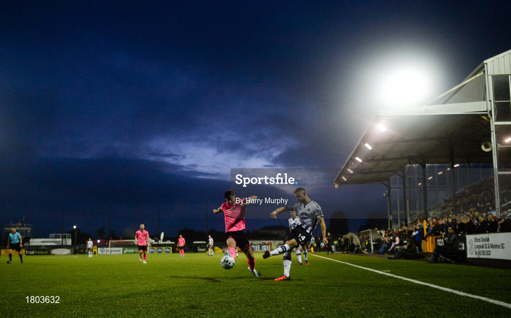 23 September 2019; General view of Dane Massey of Dundalk in action against Ronan Finn of Shamrock Rovers during the SSE Airtricity League Premier Division match between Dundalk and Shamrock Rovers at Oriel Park in Dundalk, Co Louth. Photo by Harry Murphy/Sportsfile