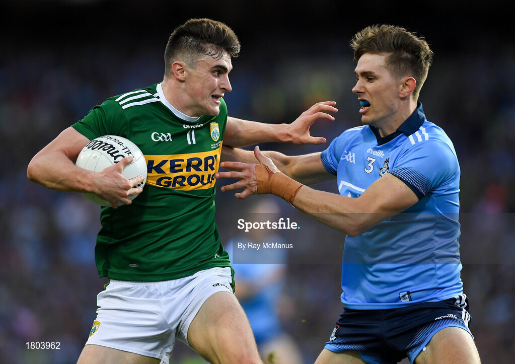 14 September 2019; Seán O'Shea of Kerry is tackled by Michael Fitzsimons of Dublin during the GAA Football All-Ireland Senior Championship Final Replay match between Dublin and Kerry at Croke Park in Dublin. Photo by Ray McManus/Sportsfile