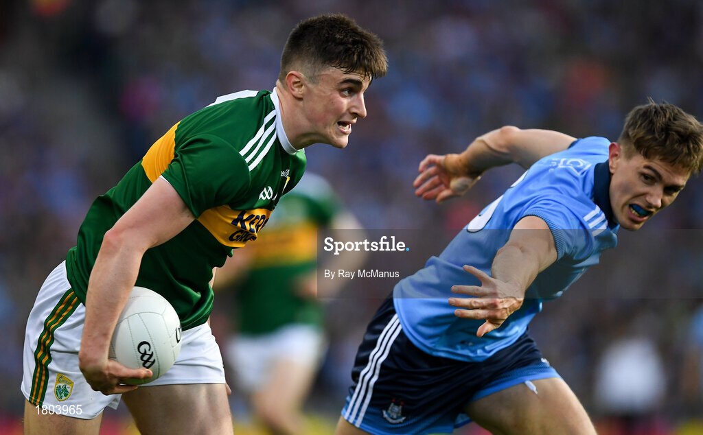 14 September 2019; Seán O'Shea of Kerry is tackled by Michael Fitzsimons of Dublin during the GAA Football All-Ireland Senior Championship Final Replay match between Dublin and Kerry at Croke Park in Dublin. Photo by Ray McManus/Sportsfile