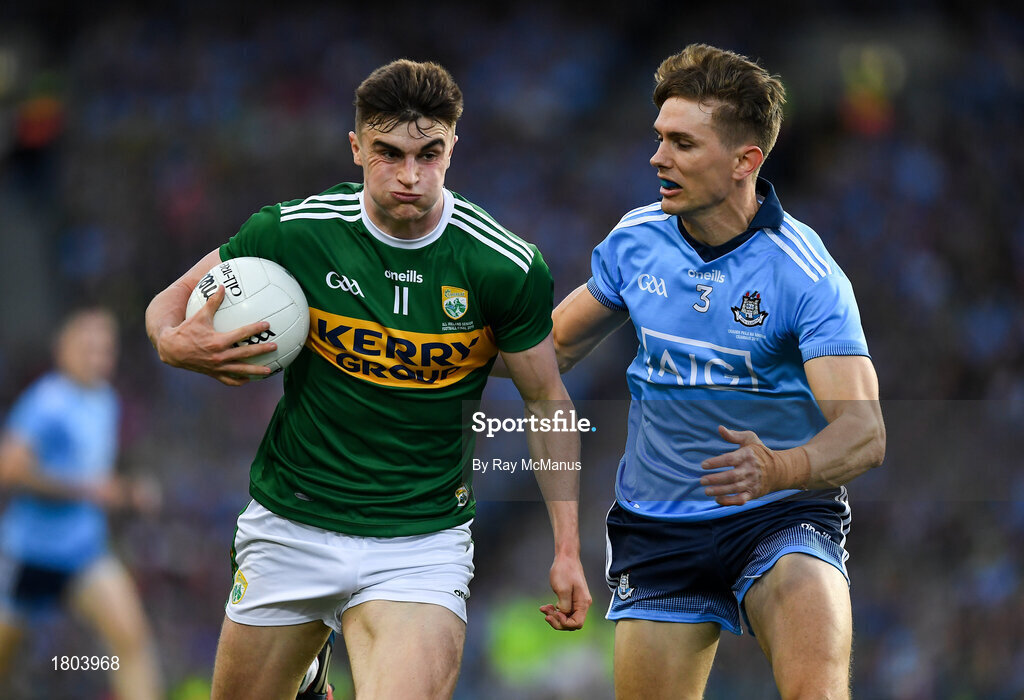 14 September 2019; Seán O'Shea of Kerry is tackled by Michael Fitzsimons of Dublin during the GAA Football All-Ireland Senior Championship Final Replay match between Dublin and Kerry at Croke Park in Dublin. Photo by Ray McManus/Sportsfile