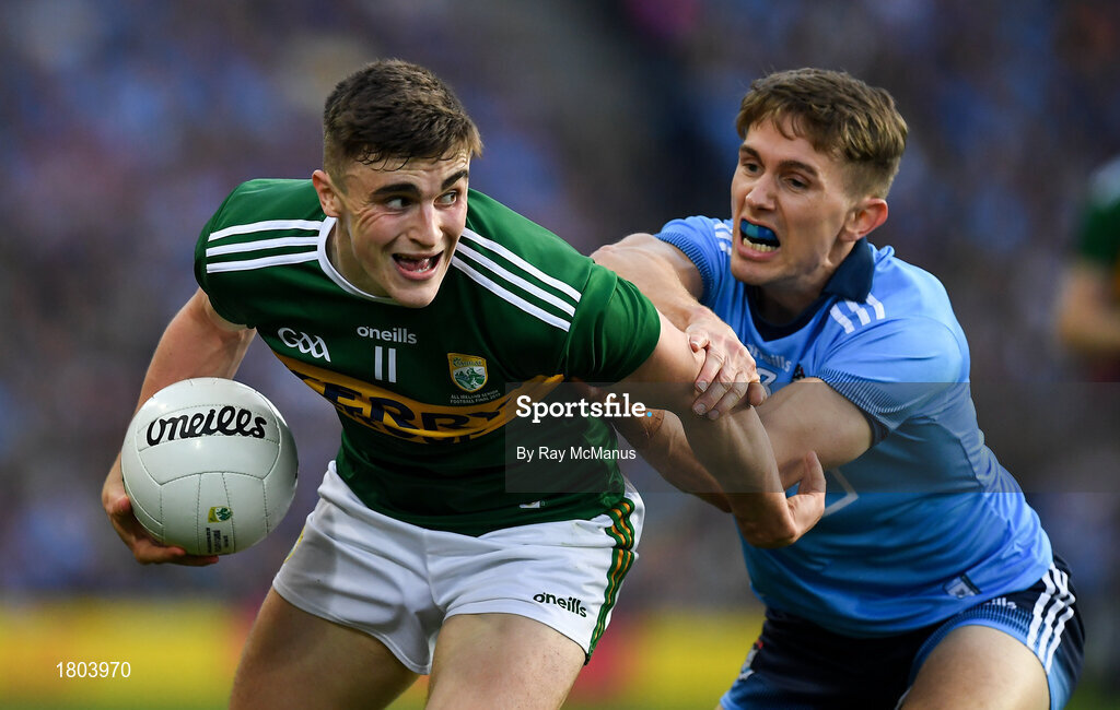 14 September 2019; Seán O'Shea of Kerry is tackled by Michael Fitzsimons of Dublin during the GAA Football All-Ireland Senior Championship Final Replay match between Dublin and Kerry at Croke Park in Dublin. Photo by Ray McManus/Sportsfile