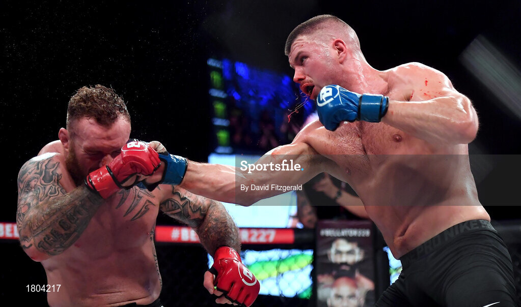 27 September 2019; Karl Moore, right, in action against Lee Chadwick during their light-heavyweight bout at Bellator Dublin in the 3Arena, Dublin. Photo by David Fitzgerald/Sportsfile
