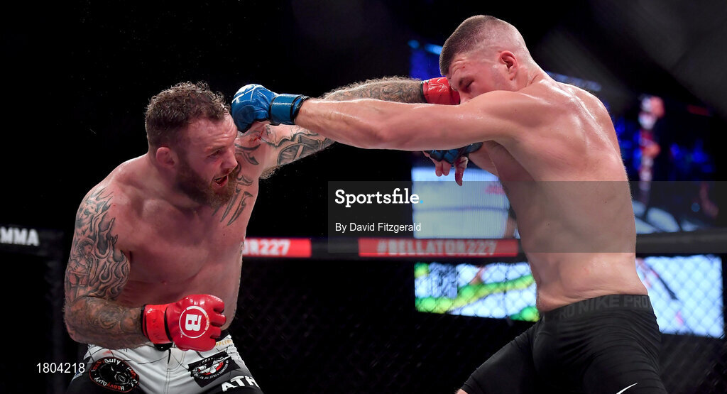27 September 2019; Lee Chadwick, left, in action against Karl Moore during their light-heavyweight bout at Bellator Dublin in the 3Arena, Dublin. Photo by David Fitzgerald/Sportsfile