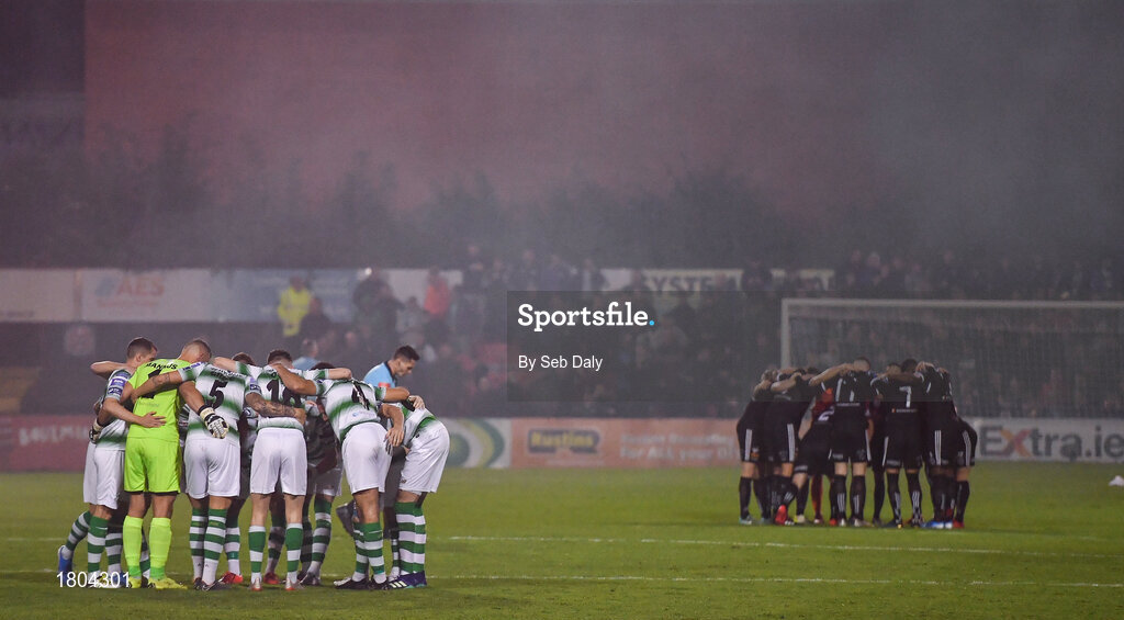 27 September 2019; Shamrock Rovers and Bohemians players in team huddles prior to the Extra.ie FAI Cup Semi-Final match between Bohemians and Shamrock Rovers at Dalymount Park in Dublin. Photo by Seb Daly/Sportsfile