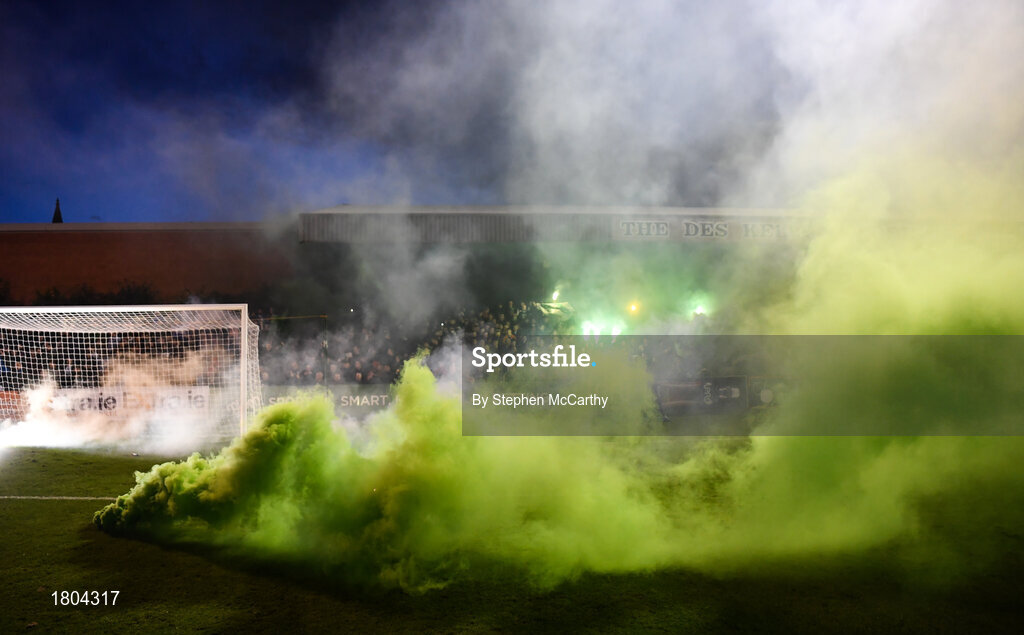 27 September 2019; Smoke flares on the pitch during the Extra.ie FAI Cup Semi-Final match between Bohemians and Shamrock Rovers at Dalymount Park in Dublin. Photo by Stephen McCarthy/Sportsfile