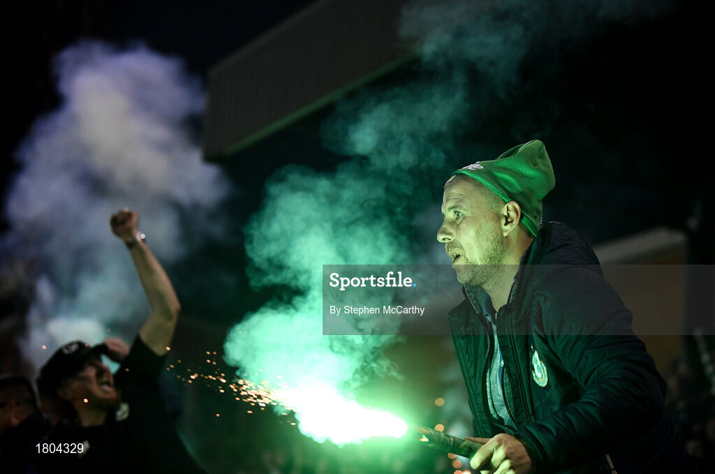 27 September 2019; A Shamrock Rovers supporter during the Extra.ie FAI Cup Semi-Final match between Bohemians and Shamrock Rovers at Dalymount Park in Dublin. Photo by Stephen McCarthy/Sportsfile