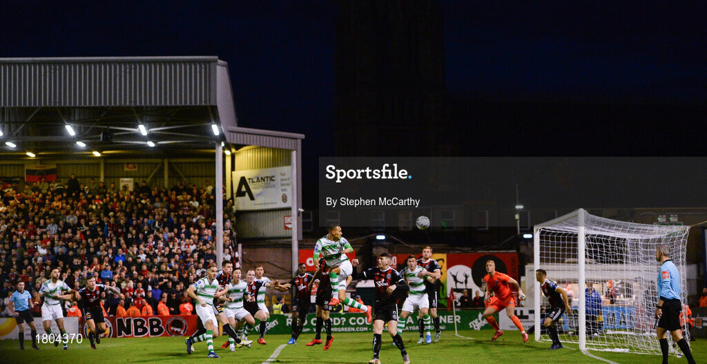 27 September 2019; Graham Burke of Shamrock Rovers heads his side's first goal during the Extra.ie FAI Cup Semi-Final match between Bohemians and Shamrock Rovers at Dalymount Park in Dublin. Photo by Stephen McCarthy/Sportsfile