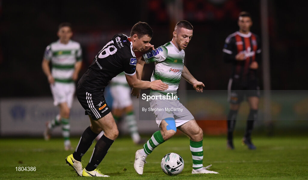 27 September 2019; Jack Byrne of Shamrock Rovers in action against James Finnerty of Bohemians during the Extra.ie FAI Cup Semi-Final match between Bohemians and Shamrock Rovers at Dalymount Park in Dublin. Photo by Stephen McCarthy/Sportsfile