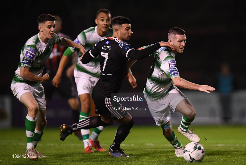 27 September 2019; Jack Byrne of Shamrock Rovers is tackled by Danny Mandroiu of Bohemians during the Extra.ie FAI Cup Semi-Final match between Bohemians and Shamrock Rovers at Dalymount Park in Dublin. Photo by Stephen McCarthy/Sportsfile