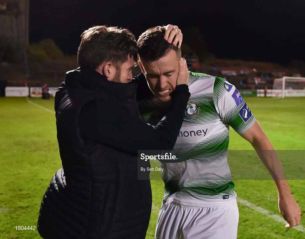 27 September 2019; Aaron Greene of Shamrock Rovers is congratulated by his manager Stephen Bradley after scoring his side's second goal during the Extra.ie FAI Cup Semi-Final match between Bohemians and Shamrock Rovers at Dalymount Park in Dublin. Photo by Seb Daly/Sportsfile