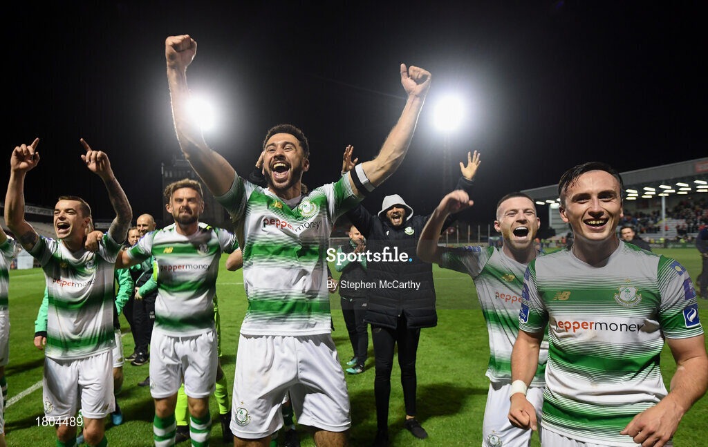 27 September 2019; Shamrock Rovers players, from left, Sean Kavanagh, Greg Bolger, Roberto Lopes, Jack Byrne and Aaron McEneff celebrate following the Extra.ie FAI Cup Semi-Final match between Bohemians and Shamrock Rovers at Dalymount Park in Dublin. Photo by Stephen McCarthy/Sportsfile