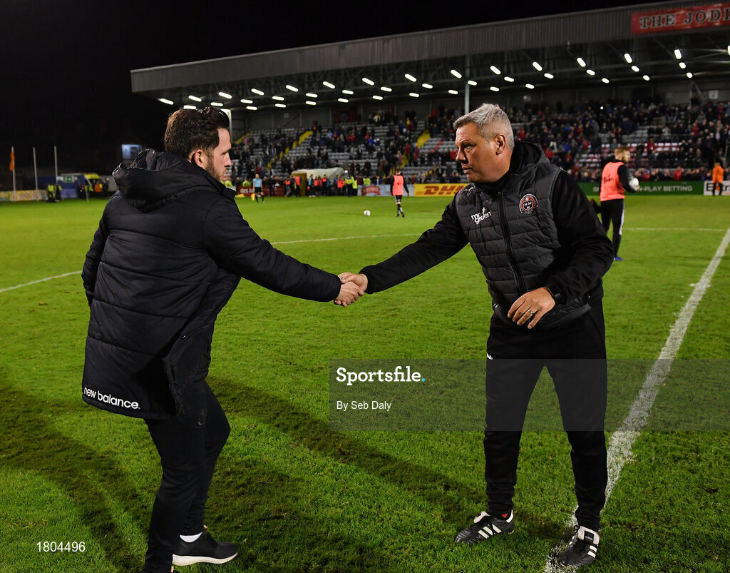 27 September 2019; Shamrock Rovers manager Stephen Bradley, left, and Bohemians manager Keith Long shake hands following the Extra.ie FAI Cup Semi-Final match between Bohemians and Shamrock Rovers at Dalymount Park in Dublin. Photo by Seb Daly/Sportsfile