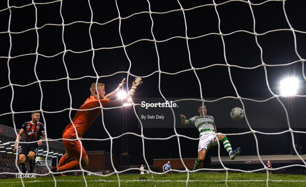 27 September 2019; Aaron Greene of Shamrock Rovers shoots to score his side's second goal past James Talbot of Bohemians during the Extra.ie FAI Cup Semi-Final match between Bohemians and Shamrock Rovers at Dalymount Park in Dublin. Photo by Seb Daly/Sportsfile