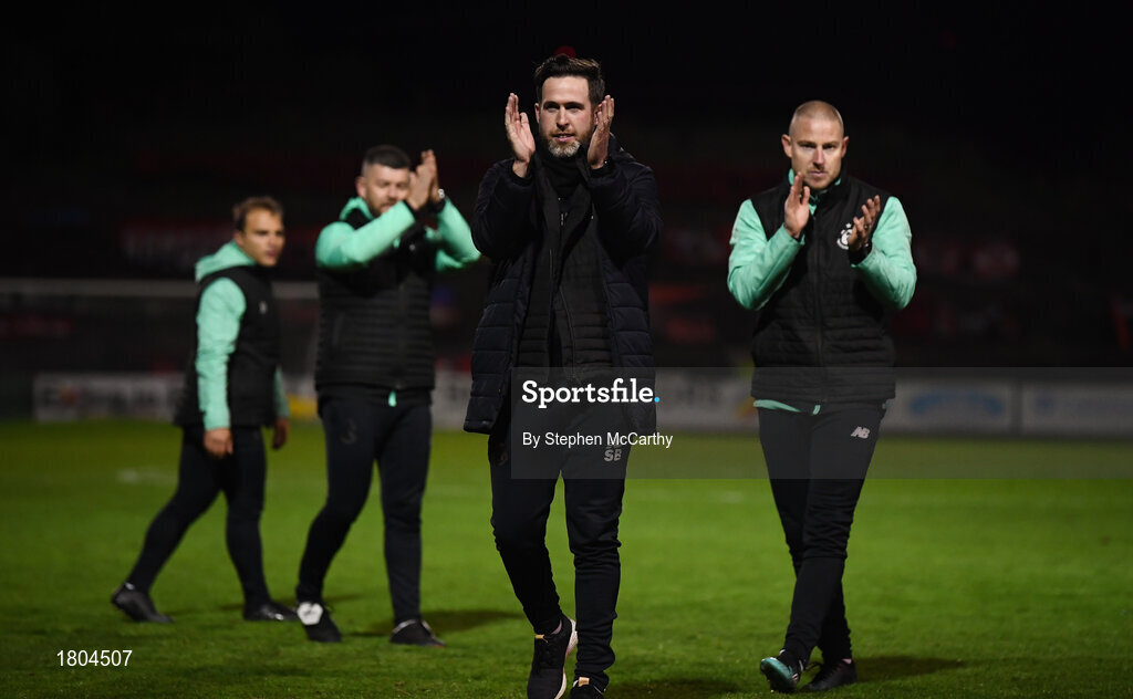 27 September 2019; Shamrock Rovers manager Stephen Bradley celebrates following the Extra.ie FAI Cup Semi-Final match between Bohemians and Shamrock Rovers at Dalymount Park in Dublin. Photo by Stephen McCarthy/Sportsfile