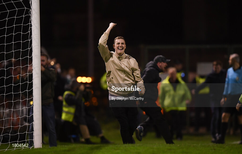 27 September 2019; A Shamrock Rovers supporter taunts supporters following his side's second goal during the Extra.ie FAI Cup Semi-Final match between Bohemians and Shamrock Rovers at Dalymount Park in Dublin. Photo by Stephen McCarthy/Sportsfile