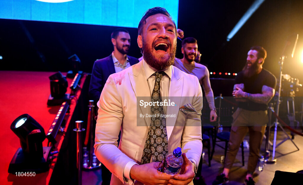27 September 2019; UFC fighter Conor McGregor celebrates after team-mate Peter Queally was declared victorious over Ryan Scope in their welterweight bout at Bellator Dublin in the 3Arena, Dublin. Photo by David Fitzgerald/Sportsfile