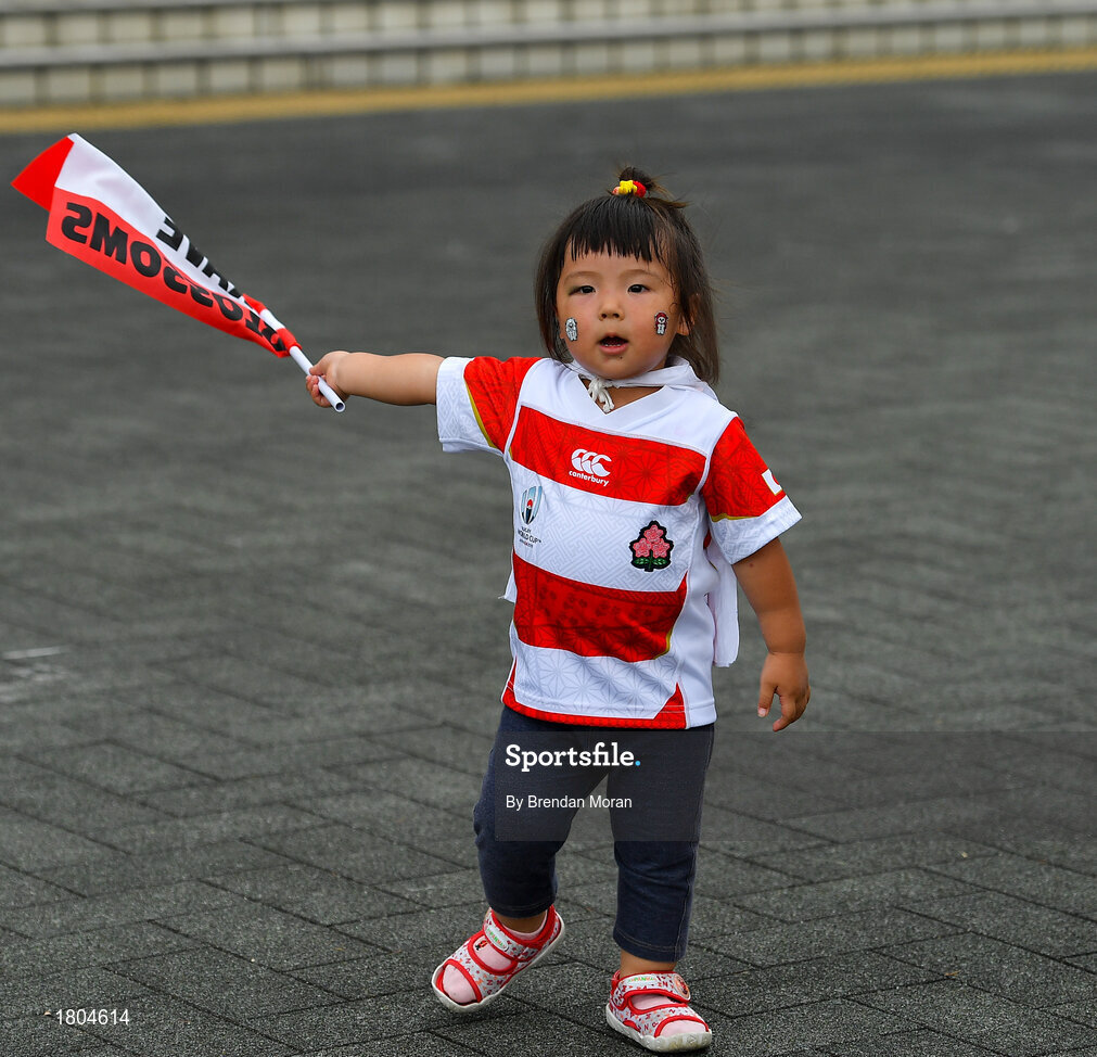 28 September 2019; A young Japanese supporter waves her flag prior to the 2019 Rugby World Cup Pool A match between Japan and Ireland at the Shizuoka Stadium Ecopa in Fukuroi, Shizuoka Prefecture, Japan. Photo by Brendan Moran/Sportsfile