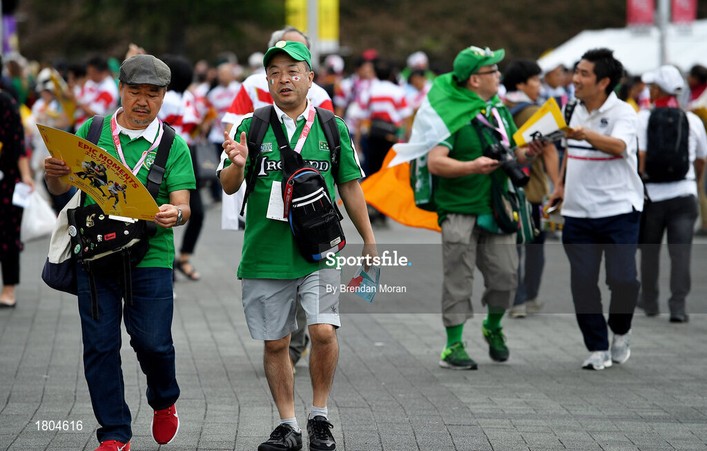 28 September 2019; Japanese Irish supporters arrive prior to the 2019 Rugby World Cup Pool A match between Japan and Ireland at the Shizuoka Stadium Ecopa in Fukuroi, Shizuoka Prefecture, Japan. Photo by Brendan Moran/Sportsfile