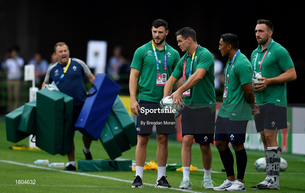 28 September 2019; Ireland players, from left, Robbie Henshaw, Jonathan Sexton, Bundee Aki and Jack Conan prior to the 2019 Rugby World Cup Pool A match between Japan and Ireland at the Shizuoka Stadium Ecopa in Fukuroi, Shizuoka Prefecture, Japan. Photo by Brendan Moran/Sportsfile