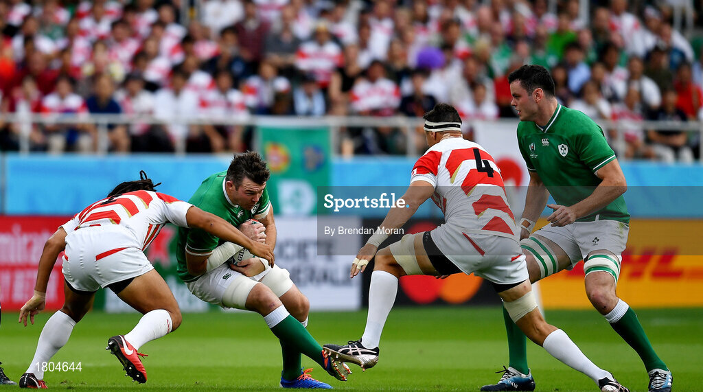 28 September 2019; Peter O'Mahony of Ireland is tackled by Jiwon Koo of Japan prior to the 2019 Rugby World Cup Pool A match between Japan and Ireland at the Shizuoka Stadium Ecopa in Fukuroi, Shizuoka Prefecture, Japan. Photo by Brendan Moran/Sportsfile