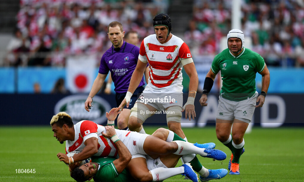 28 September 2019; Lomano Lemeki of Japan is tackled by Rob Kearney of Ireland to the 2019 Rugby World Cup Pool A match between Japan and Ireland at the Shizuoka Stadium Ecopa in Fukuroi, Shizuoka Prefecture, Japan. Photo by Brendan Moran/Sportsfile