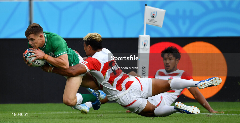 28 September 2019; Garry Ringrose of Ireland scores his side's first try despite the tackle of Lomano Lemeki of Japan during the 2019 Rugby World Cup Pool A match between Japan and Ireland at the Shizuoka Stadium Ecopa in Fukuroi, Shizuoka Prefecture, Japan. Photo by Brendan Moran/Sportsfile
