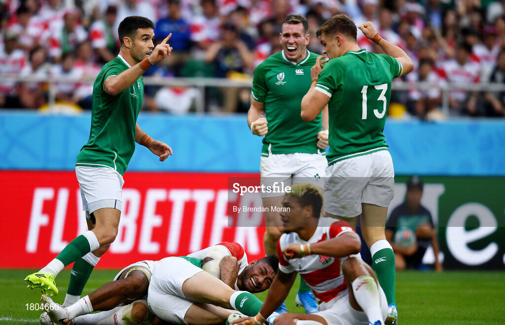 28 September 2019; Ireland players, from left, Conor Murray, Chris Farrell and Garry Ringrose react to team-mate Rob Kearney scoring their second try during the 2019 Rugby World Cup Pool A match between Japan and Ireland at the Shizuoka Stadium Ecopa in Fukuroi, Shizuoka Prefecture, Japan. Photo by Brendan Moran/Sportsfile