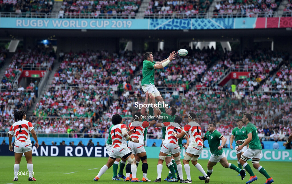 28 September 2019; Peter O'Mahony of Ireland takes possession from a lineout during the 2019 Rugby World Cup Pool A match between Japan and Ireland at the Shizuoka Stadium Ecopa in Fukuroi, Shizuoka Prefecture, Japan. Photo by Brendan Moran/Sportsfile