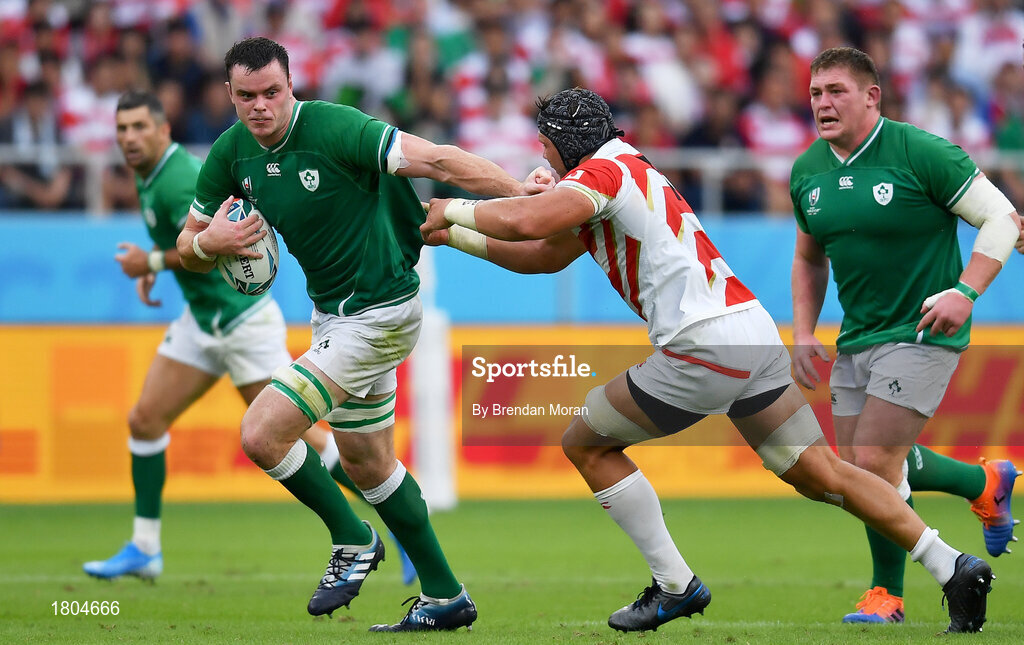 28 September 2019; James Ryan of Ireland is tackled by Pieter Labuschagne of Japan during the 2019 Rugby World Cup Pool A match between Japan and Ireland at the Shizuoka Stadium Ecopa in Fukuroi, Shizuoka Prefecture, Japan. Photo by Brendan Moran/Sportsfile