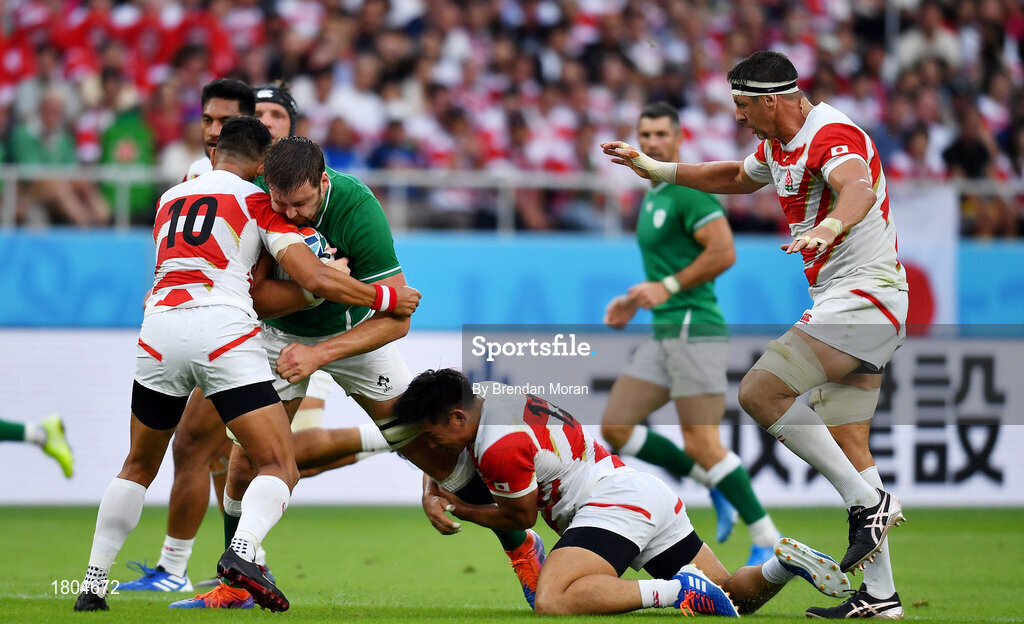 28 September 2019; Iain Henderson of Ireland is tackled by Yu Tamura, 10, and Timothy Lafaele of Japan during the 2019 Rugby World Cup Pool A match between Japan and Ireland at the Shizuoka Stadium Ecopa in Fukuroi, Shizuoka Prefecture, Japan. Photo by Brendan Moran/Sportsfile