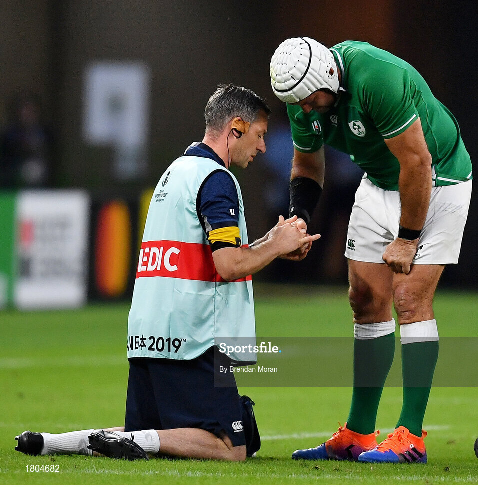 28 September 2019; Rory Best of Ireland is attended to by Ireland team physio Keith Fox during the 2019 Rugby World Cup Pool A match between Japan and Ireland at the Shizuoka Stadium Ecopa in Fukuroi, Shizuoka Prefecture, Japan. Photo by Brendan Moran/Sportsfile