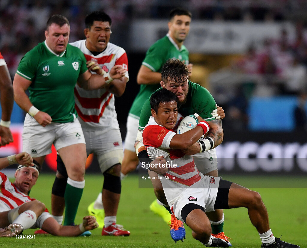28 September 2019; Yutaka Nagare of Japan is tackled by Andrew Porter of Ireland during the 2019 Rugby World Cup Pool A match between Japan and Ireland at the Shizuoka Stadium Ecopa in Fukuroi, Shizuoka Prefecture, Japan. Photo by Brendan Moran/Sportsfile