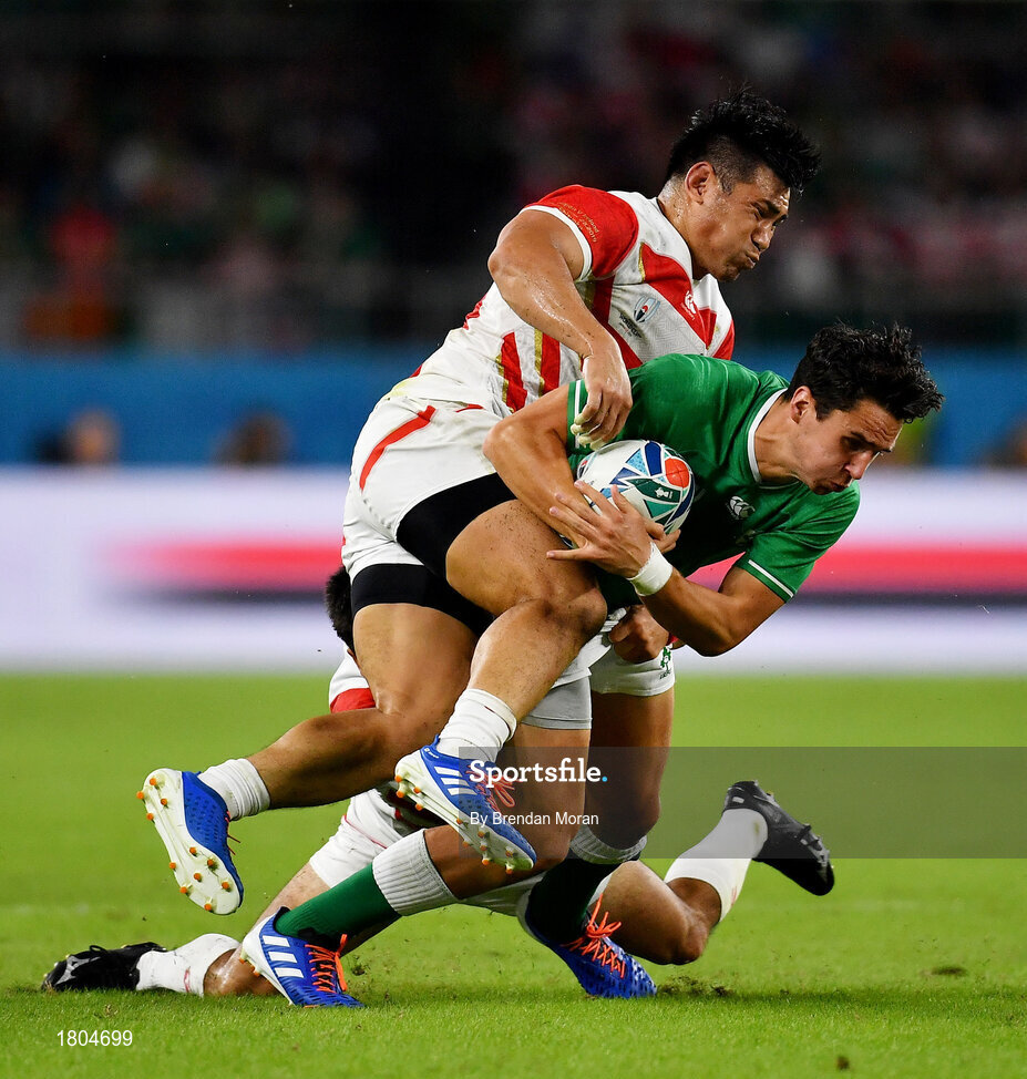 28 September 2019; Joey Carbery of Ireland is tackled by Ryoto Nakamura, left, and Shota Horie of Japan during the 2019 Rugby World Cup Pool A match between Japan and Ireland at the Shizuoka Stadium Ecopa in Fukuroi, Shizuoka Prefecture, Japan. Photo by Brendan Moran/Sportsfile