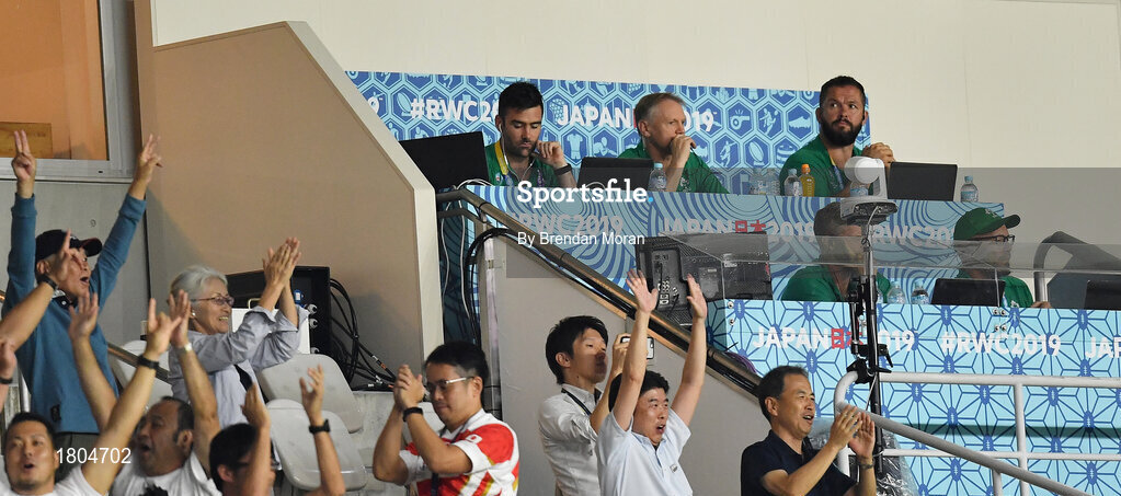 28 September 2019; Ireland head coach Joe Schmidt watches on as Japan supporters celebrate a penalty during the 2019 Rugby World Cup Pool A match between Japan and Ireland at the Shizuoka Stadium Ecopa in Fukuroi, Shizuoka Prefecture, Japan. Photo by Brendan Moran/Sportsfile