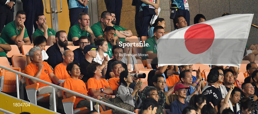 28 September 2019; Jonathan Sexton and other members of the Ireland squad watch on during the 2019 Rugby World Cup Pool A match between Japan and Ireland at the Shizuoka Stadium Ecopa in Fukuroi, Shizuoka Prefecture, Japan. Photo by Brendan Moran/Sportsfile