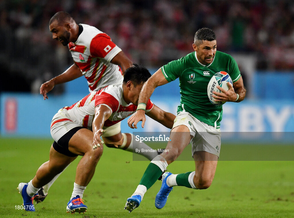 28 September 2019; Rob Kearney of Ireland is tackled by Ryoto Nakamura of Japan during the 2019 Rugby World Cup Pool A match between Japan and Ireland at the Shizuoka Stadium Ecopa in Fukuroi, Shizuoka Prefecture, Japan. Photo by Brendan Moran/Sportsfile