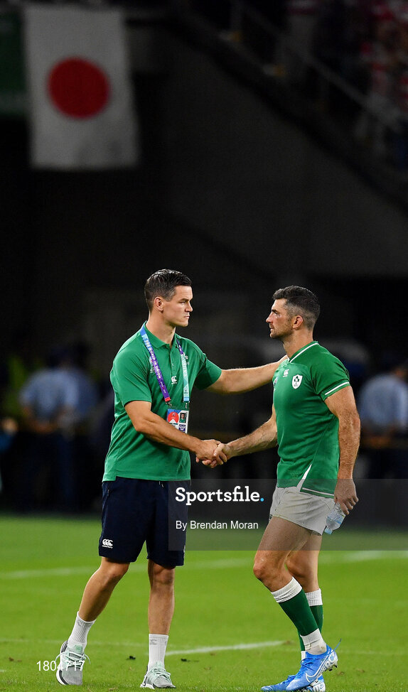 28 September 2019; Jonathan Sexton, left, and Keith Earls of Ireland following the 2019 Rugby World Cup Pool A match between Japan and Ireland at the Shizuoka Stadium Ecopa in Fukuroi, Shizuoka Prefecture, Japan. Photo by Brendan Moran/Sportsfile