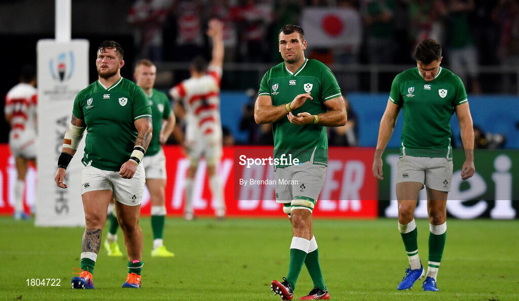 28 September 2019; Ireland players, from left, Andrew Porter, Tadhg Beirne and Jacob Stockdale following the 2019 Rugby World Cup Pool A match between Japan and Ireland at the Shizuoka Stadium Ecopa in Fukuroi, Shizuoka Prefecture, Japan. Photo by Brendan Moran/Sportsfile