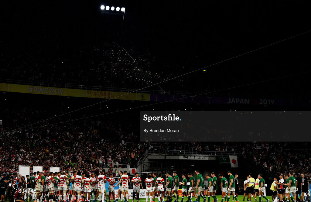 28 September 2019; Ireland are applauded from the pitch by Japan players following the 2019 Rugby World Cup Pool A match between Japan and Ireland at the Shizuoka Stadium Ecopa in Fukuroi, Shizuoka Prefecture, Japan. Photo by Brendan Moran/Sportsfile