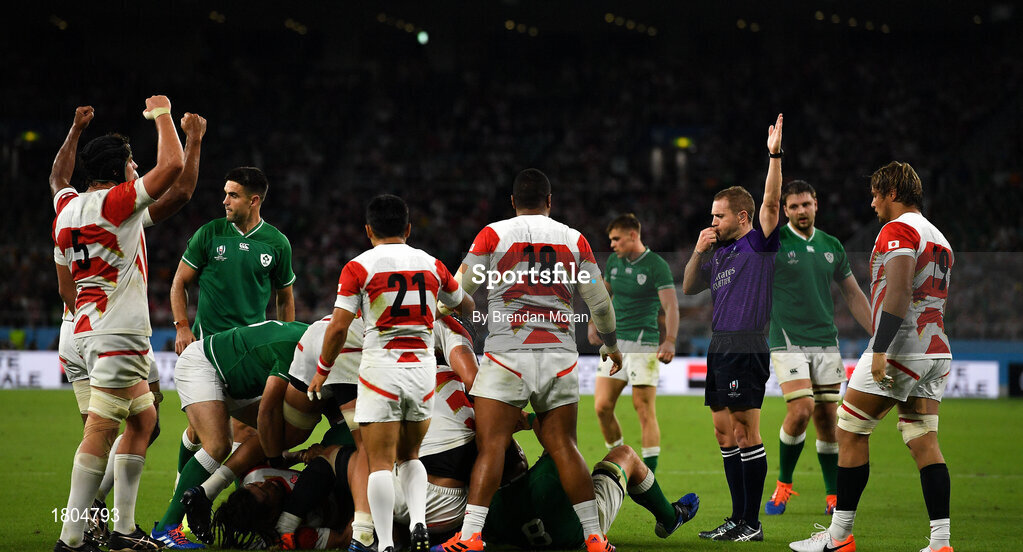 28 September 2019; Referee Angus Gardner awards a late penalty to Japan during the 2019 Rugby World Cup Pool A match between Japan and Ireland at the Shizuoka Stadium Ecopa in Fukuroi, Shizuoka Prefecture, Japan. Photo by Brendan Moran/Sportsfile