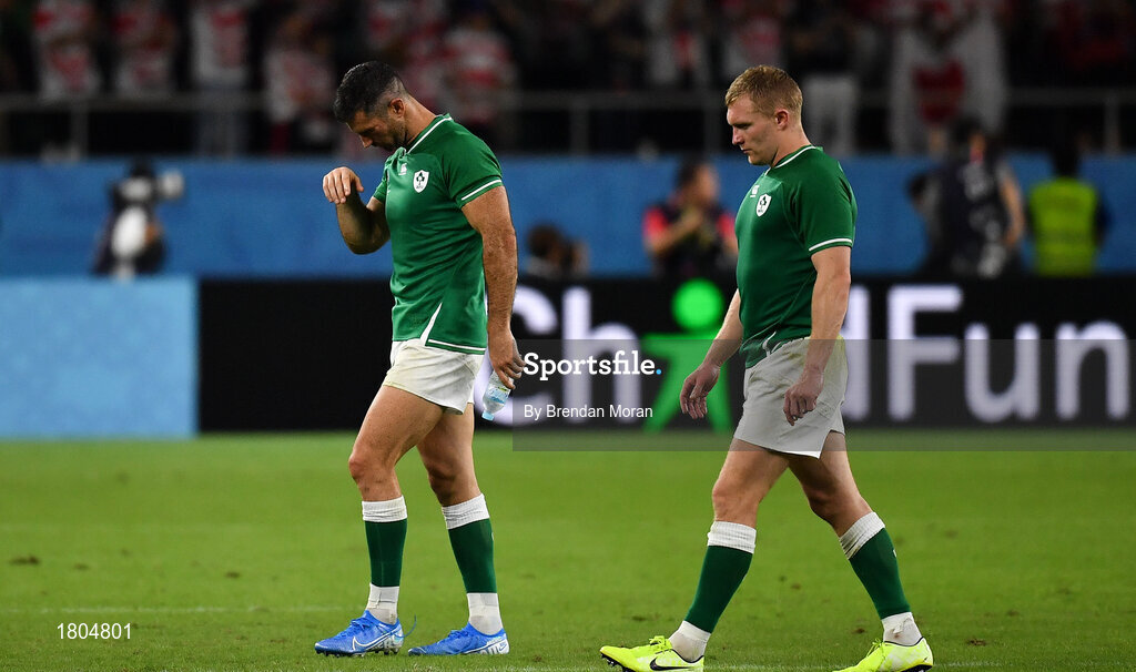 28 September 2019; Rob Kearney, left, and Keith Earls of Ireland the pitch after the 2019 Rugby World Cup Pool A match between Japan and Ireland at the Shizuoka Stadium Ecopa in Fukuroi, Shizuoka Prefecture, Japan. Photo by Brendan Moran/Sportsfile