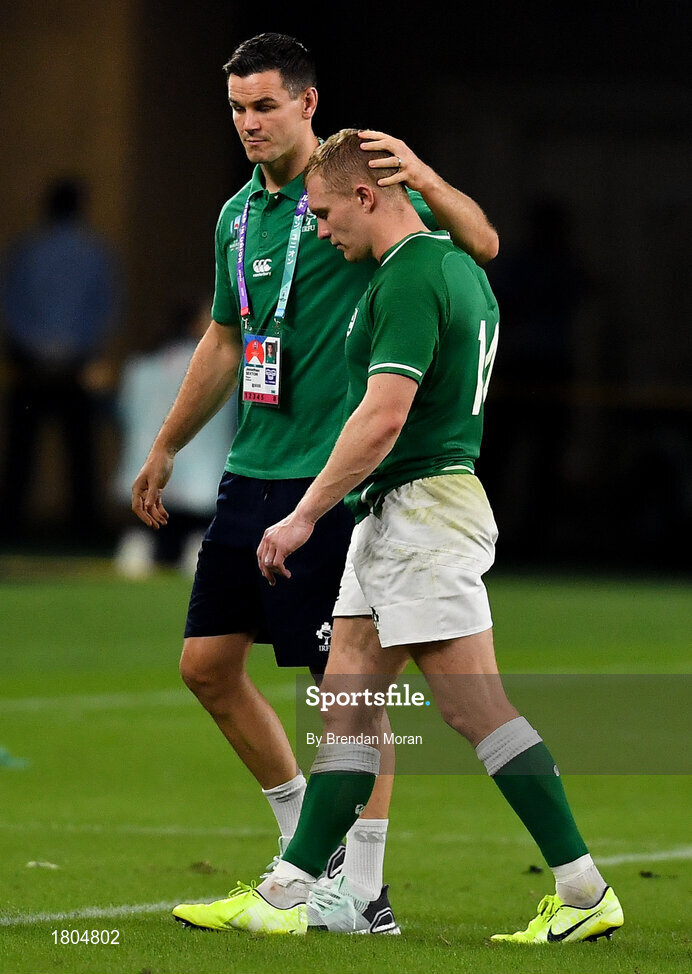 28 September 2019; Jonathan Sexton of Ireland, left, with team-mate Keith Earls after the 2019 Rugby World Cup Pool A match between Japan and Ireland at the Shizuoka Stadium Ecopa in Fukuroi, Shizuoka Prefecture, Japan. Photo by Brendan Moran/Sportsfile