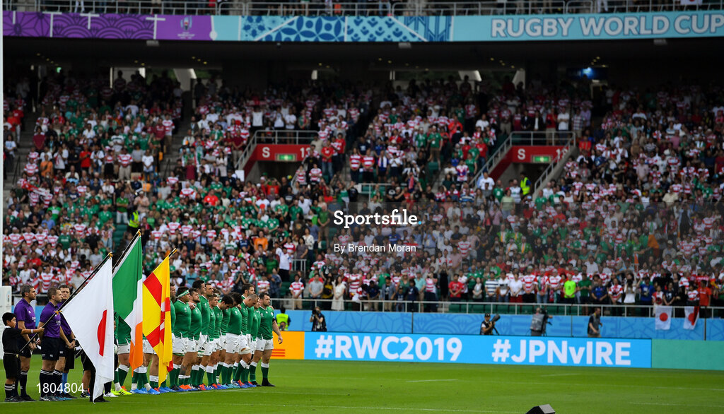 28 September 2019; The Ireland team stand for the anthems prior to the 2019 Rugby World Cup Pool A match between Japan and Ireland at the Shizuoka Stadium Ecopa in Fukuroi, Shizuoka Prefecture, Japan. Photo by Brendan Moran/Sportsfile