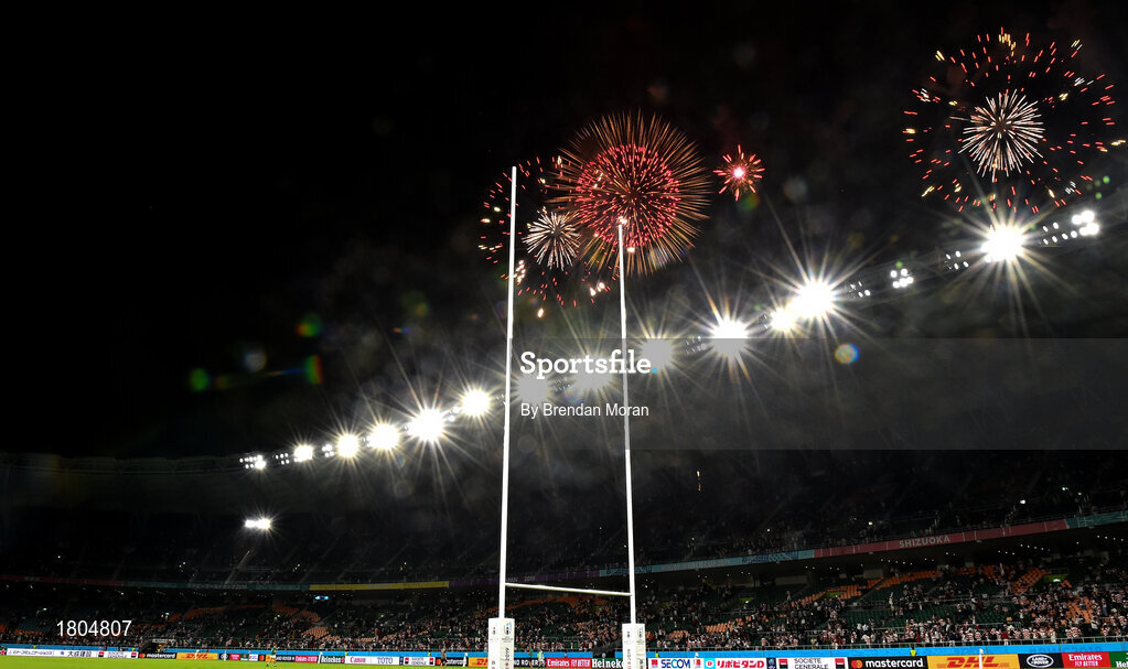 28 September 2019; Fireworks are seen after the 2019 Rugby World Cup Pool A match between Japan and Ireland at the Shizuoka Stadium Ecopa in Fukuroi, Shizuoka Prefecture, Japan. Photo by Brendan Moran/Sportsfile