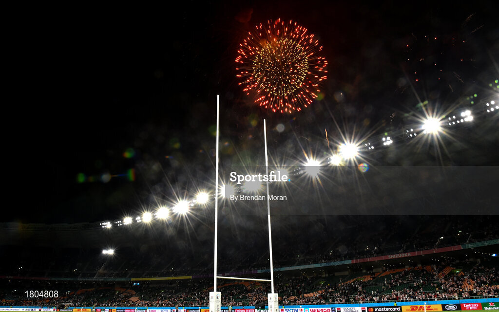 28 September 2019; Fireworks are seen after the 2019 Rugby World Cup Pool A match between Japan and Ireland at the Shizuoka Stadium Ecopa in Fukuroi, Shizuoka Prefecture, Japan. Photo by Brendan Moran/Sportsfile